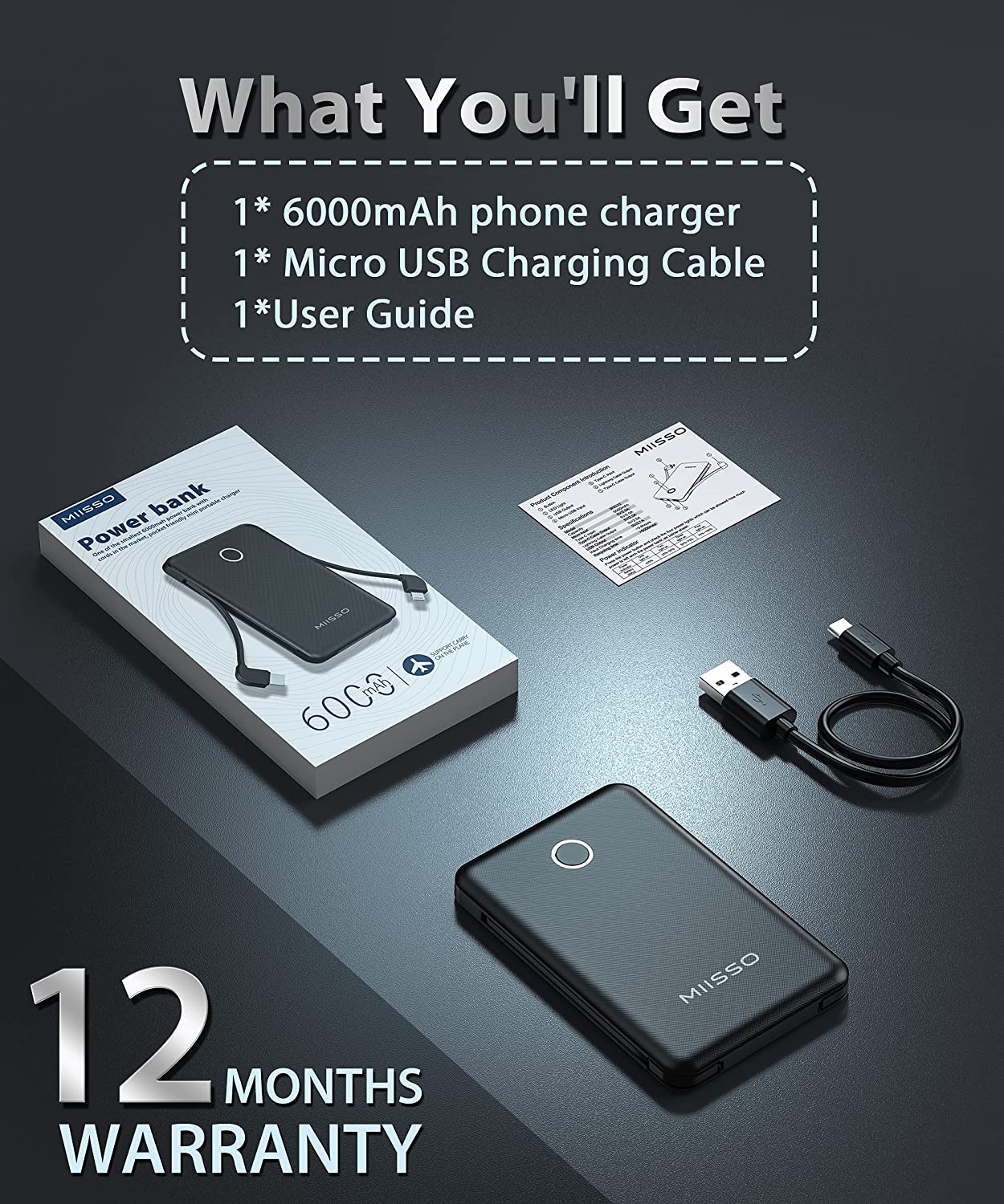 - What You’ll Get: 1* 6000mAh phone charger, 1* Micro USB Charging Cable for charging powerbank itself (charging cable for iPhone & type c charging cable & AC adapter NOT included), 1*User Guide, 12 months warranty and friendly & outstanding customer service.