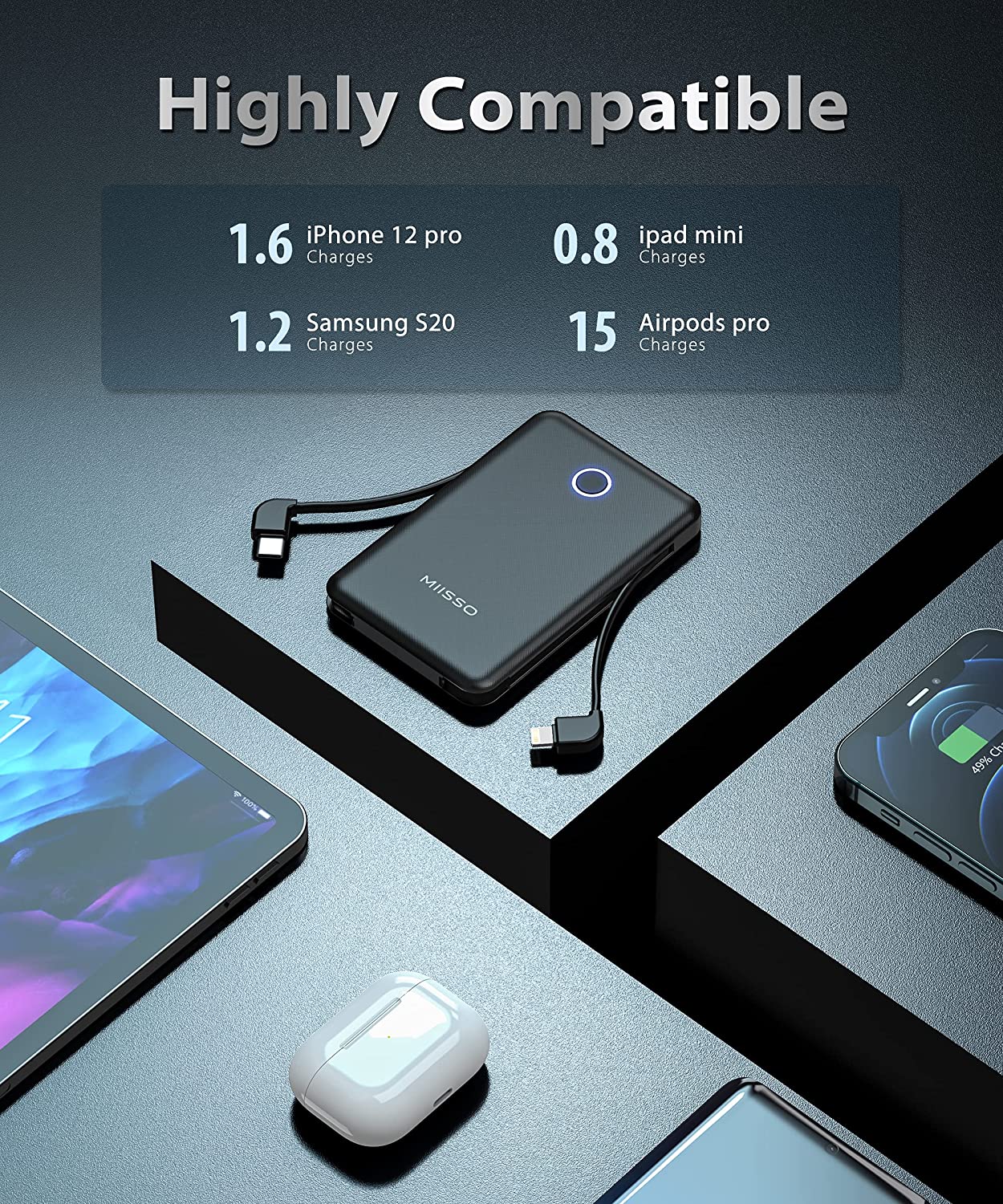 - Ultra-slim Power Bank: Only 4.13*2.52*0.51 inch Small Power Bank ;The most powerful 6000mAh battery pack, fully charges an iPhone 6/7/8 up to 2.3 times, or an iPhone 6 Plus/7 Plus/8 Plus up to 1.23 times, or an iPhone 11/11 pro up to 1.12 times, or an iPhone X/Xs up to 1.3 times , or an iPhone 12/12 Pro up to 1.26 times, or an iPhone12 Pro Max up to 1 times; Travel around fit-able in pocket. With 4 LED indicators to show remaining capacity.